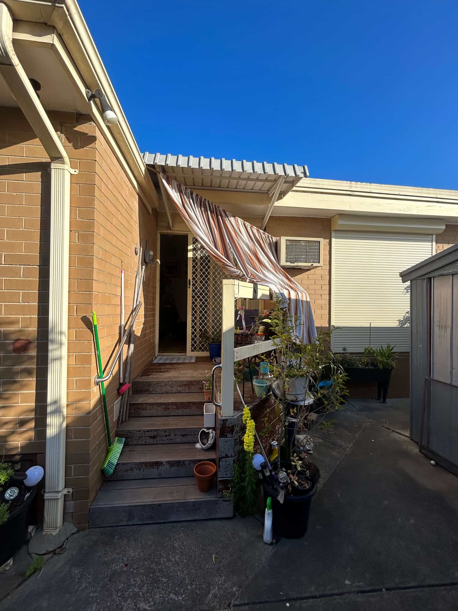 Before: Weathered timber landing with peeling paint and dated striped awning.