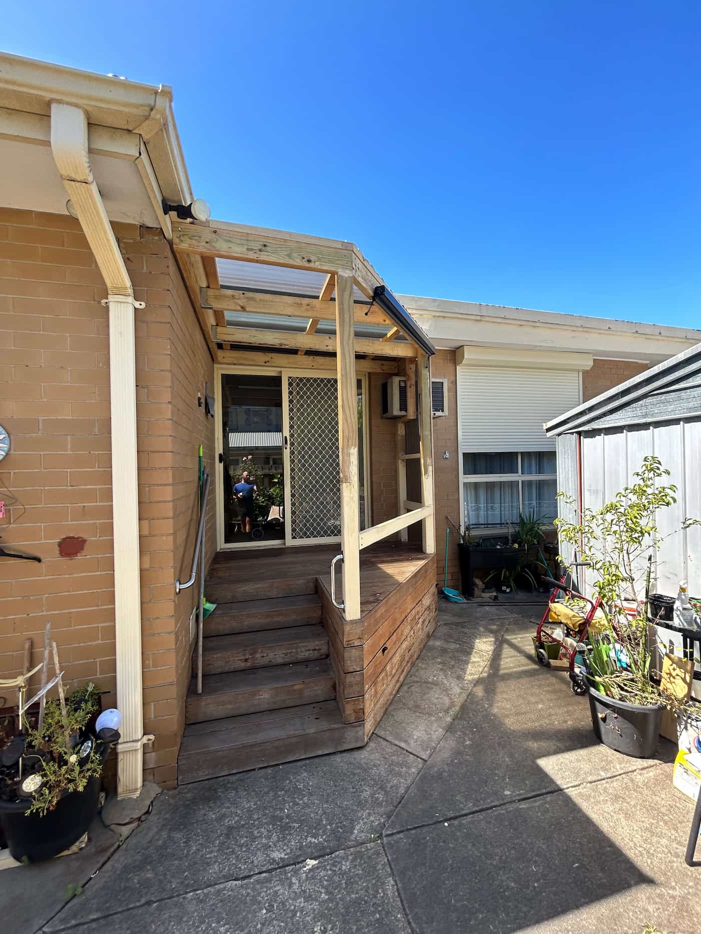 Construction: Installing new landing, pergola roof with polycarbonate sheeting, and protective panels.